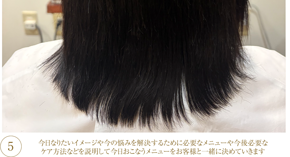 当店では最初のカウンセリングでインフォームドコンセント(納得診療)を取り入れて、ご希望のスタイルを叶えるため、毛髪診断も行い、ご自身の髪の状態を把握し、納得してから施術を受けていただくようになっています。